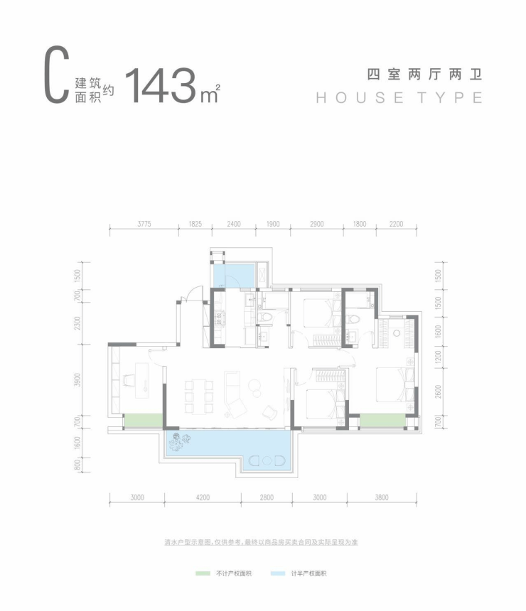 143㎡:四室两厅三卫,主卧套房+独立书房,双阳台设计