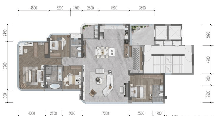▌明星户型③:建面约189㎡四房两厅三卫(高层)· 楼尊视野 中庭楼王位置,尽享小区最佳中庭景观和超大楼间距,南北朝向,采光通风俱佳· 社交方厅约76㎡LDKB中央社交方厅,满足社交、聚会等场景,开放式中西厨+灵动导台· 越级享受开间超7米,媲美市场上250㎡豪宅尺寸感,超大会客厅尽显豪宅气派· 光厅入户约12㎡光厅入户,独立拼花玄关,双侧收纳空间,满足全家需求· 中西双厨厨房约4.5米超大开间,U型设计,中西厨联动,布局合理,尺度开阔· 星级套房星级双套房设计,洞悉家庭多元所需,约42㎡环幕主卧超大套房,行政级衣帽间尽显尊贵,独立式浴缸礼致峯范人生· 超大空间实际可利用空间约建筑面积的103%