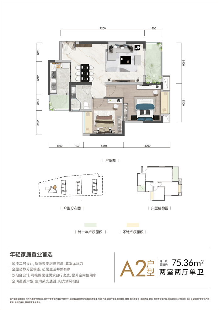 公摊18%|75㎡套二实得≈61.5㎡(等同竞品65㎡)