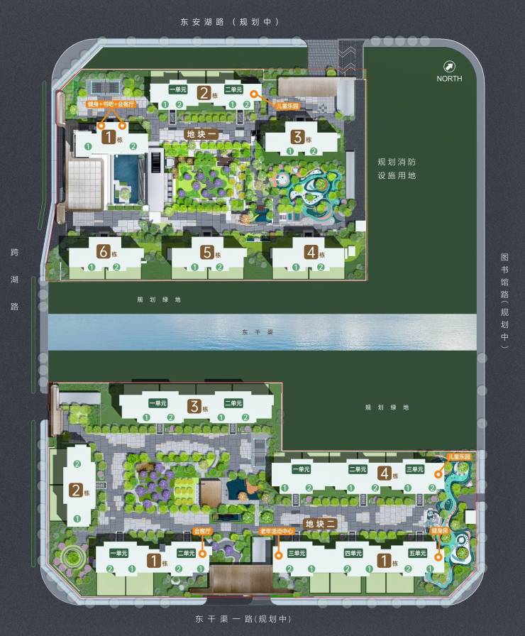 社区内打造东干渠滨河绿道+双中庭园林