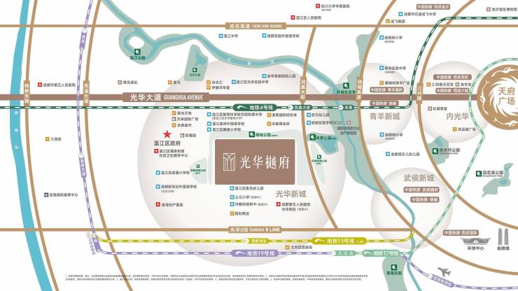 国际时尚繁华都市商圈🌿约3KM内可享受合能商业街、湟普国际综合体、新光天地、伊藤洋华堂、合生汇等成熟商业圈。双高三轨三快,立体交通网络双高:成都绕城高速度、成名高速三轨:地铁4、13、19号线三快:光华大道、光华八线、凤凰大街,顶级医疗 为家人保驾护航成都市第五人民医院(光华分院)、圣母妇产医院,护航全家健康优居。