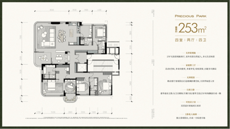 室内四花园设计:主城唯一“户内户外双花园”体验,如约183㎡户型配备约7米景观阳台。