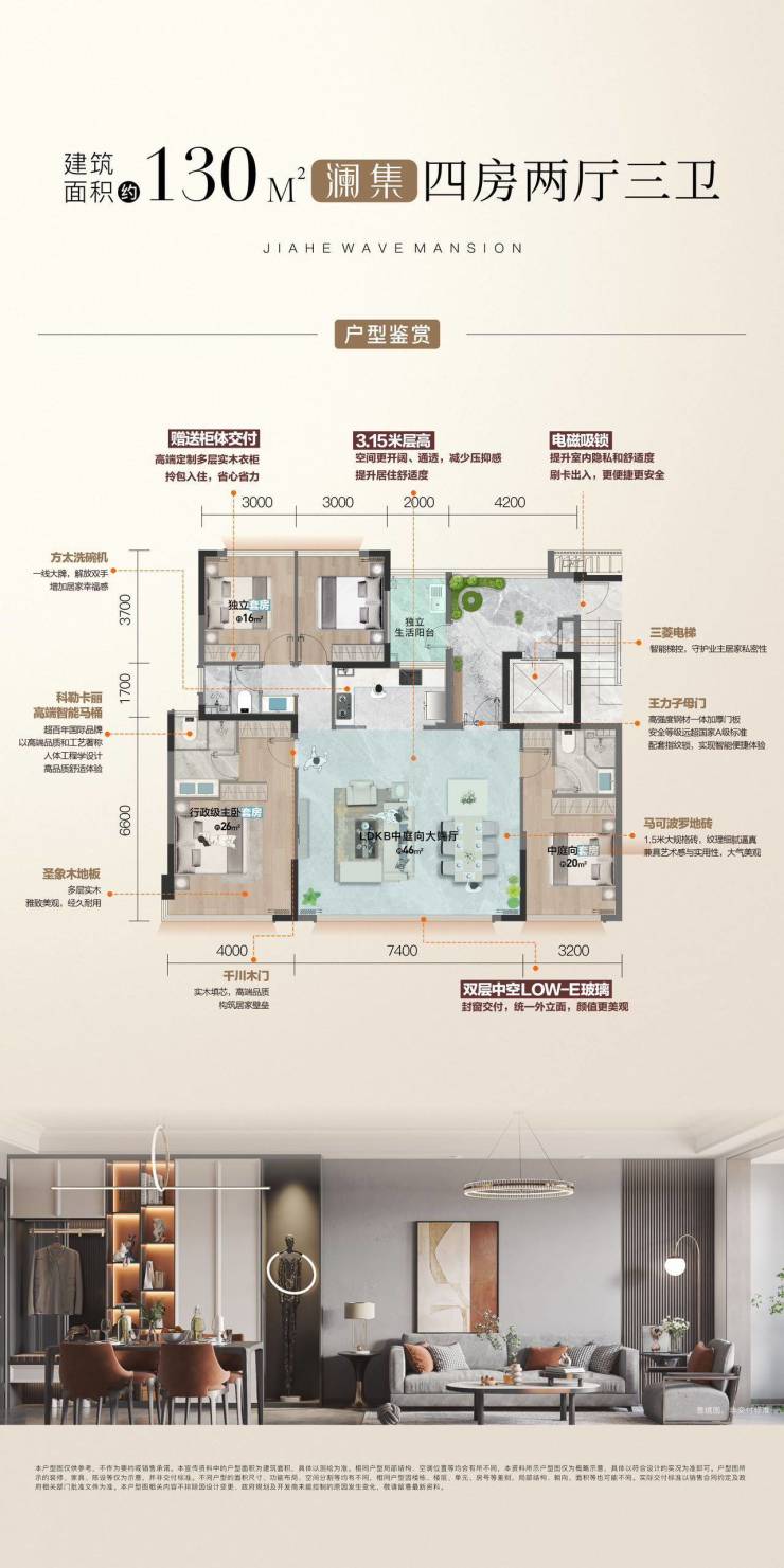卖点三;带下沉式双会所、2T2户精装纯板式 全横厅