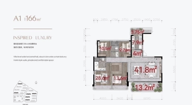 产品丰富: 稀缺涵盖精装大平层(166-188㎡)与叠拼(197-327㎡),满足不同改善需求。