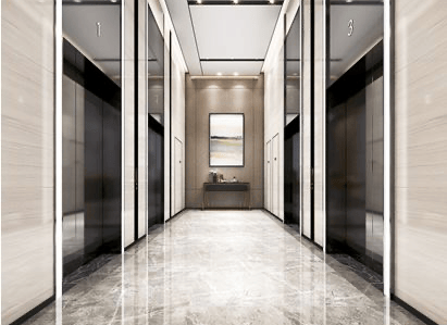 入户大堂是星级装修入户大堂,装修设计风格为国际现代设计风格,采用深灰色为主基调,运用金属,石材,镜面玻璃的经典搭配。