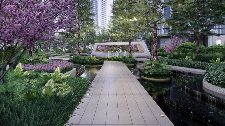 延续建筑的现代雅奢风格,营造简洁大气、时尚的景观空间。7型建筑布局,形成东西-南北两大景观轴线,宅间形成多个集中的花园空间序列;育树引林,自然复兴,依托原生树打造七组植物花园:七组植物,七重空间感受,四季有绿;七重时间花园院落、两条活力环道,打造新成都花园院落。