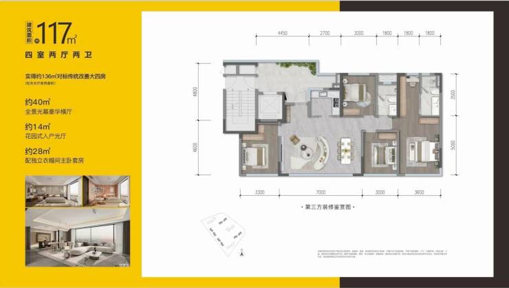 🔥建面117㎡,实得约136㎡四房双卫,约14㎡独立光厅入户,联动厨房生活空间,约17米超大面宽设计,采光景观极致享受,约40㎡幻变大横厅,超30㎡奢阔主卧套房搭配全尺寸次卧。