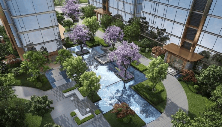 ▌【景观篇】 14%软景中水景占比约14%,媲美百亩级大盘水景规划引水入园,打造三大中庭水景,总计约1400㎡水系面积。甄选紫薇、泰山油松、蓝花楹等全球名木,匠造九章景观节点。