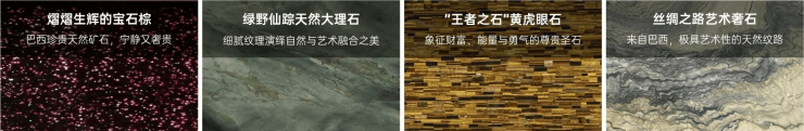 材质奢选:甄选全球超15种珍稀石材(如莫奈绿曲面奢石、白玉冰裂纹石材、意大利蓝白奢石、黄虎眼石、绿野仙踪大理石等)铺陈65米超长门廊及归家路径;立面铝板统一采用“范戴克棕”,冠顶饰以水纹铝板,尽显奢华。