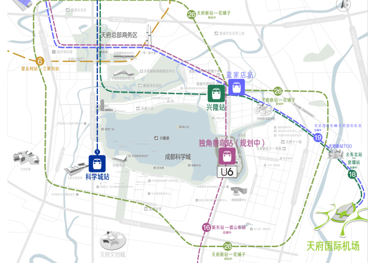 轨道交通:18号线兴隆站、16号线成都科创生态岛站(预计2024年开工)、19号线蓝家店站、天府新站(在建中)纵横路网:科学城北路、科学城中路、天府大道、梓州大道、蓉遵高速、益州大道国际机场 :天府国际机场(约30km, 18号线3站即达 ) 、双流国际机场(约25km, 19号线7站即达 )