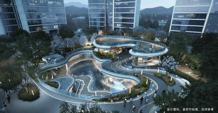 ·水翼流芯:景观设计整体形态,取境东安湖城市向往,以微流体象征水系流动韵律