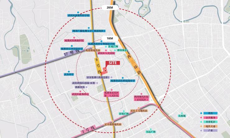 立体交通脉络 形成了三环两纵四轨的立体交通。在西3.5环的位置上,离3环路直线仅有约600余米;周边3、7、9、17号线交织,轨道网络密度超过成都多数楼市板块。距离9、17号线换乘站机投桥站直线距离仅有约715米,9号线可直达金融城,17号线二期(在建)贯穿连通成都多个主城板块,便捷度很高。