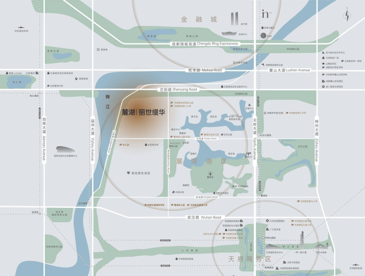 3公里内覆盖红石公园(600亩)、麓湖(约2100亩水域)