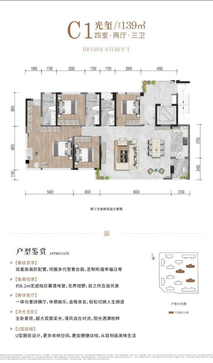 最大的亮点在于超大尺度的阳台、露台和飘窗赠送,采用了流行的横厅(LDK一体化)设计,将客厅、餐厅、厨房空间贯通,极大地提升了整个公共区域的开阔感、采光和通风效果,创造出远超预期的实际使用空间和居住体验,139户型8米无遮挡巨幕落地窗 主卧超大双面采光 双套房设计,3.15米极致层高