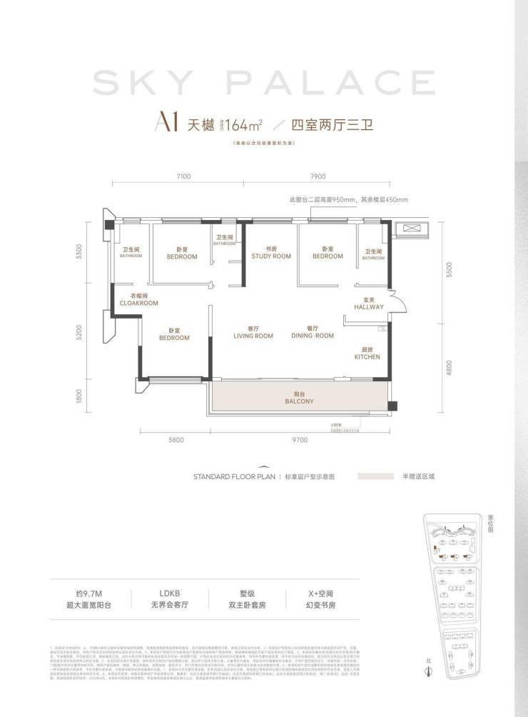A1 – 天樾(建面约164㎡ 四室两厅三卫)🌇约9.7M超奢阳台,极致观景视野🌇LDKB一体化会客厅,社交、聚会生活场🌇墅级双主卧套房,尽显主人生活品位🌇独立灵动书房空间,栖息身心的理想国