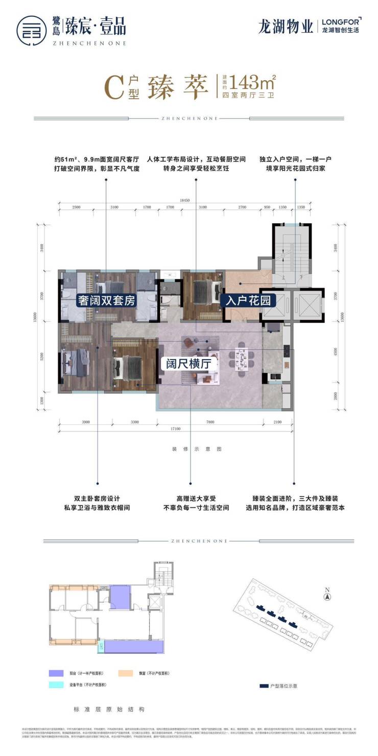 产品力:1梯1户纯洋房+叠拼,得房率120%,龙湖物业(2.5元/㎡/月)