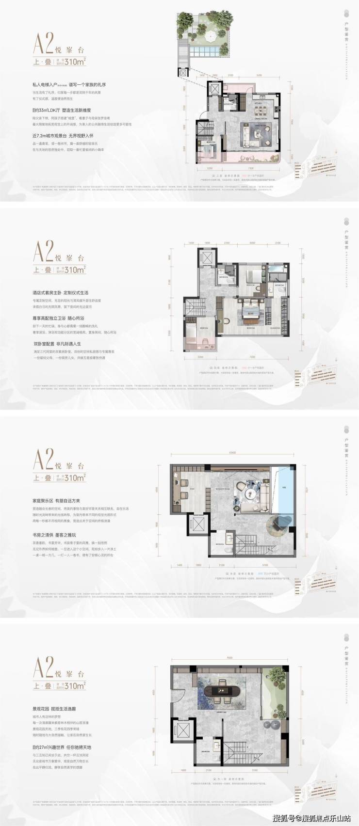 叠拼户型图:城市公园墅院【约310㎡-320㎡】4F上下真叠墅,户户花园配置。独立入户,尊享归家仪式感。一层一世界,一院一天地,显赫与栖隐,皆归于一席城市公园墅