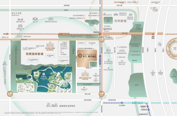 择址成都后花园温江凤栖·湖岸新城,继东安湖、怡心湖之后,围绕凤栖湖(在建中)为中心,以“凤栖绿境,创智云湖”为主题,环湖打造约12.62平方公里未来活力湖滨城,构筑新一代「城西创智生态绿核」,填补城西产城湖空白,定鼎下一代城市极核。