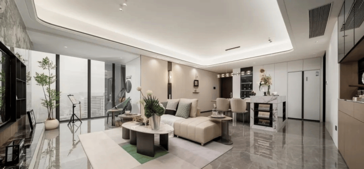 首层入户大堂采用了精装交付,层高约6米,整体风格为现代简约,通过顶部和墙面格栅、装饰线条的设计,再加上软装的搭配,进一步提升了整体质感。