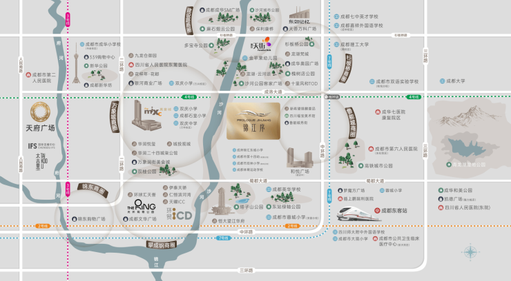 入主鎏金二环 标定一城大势成都二环是主城千年文脉汇聚之地;城市发展的肇始之境;焕新升级的核心片区;高端人居的璀璨聚集地。聚集了万象城/东郊记忆/339/太古里/IFS/九眼桥等地标,托举二环板块价值高度。