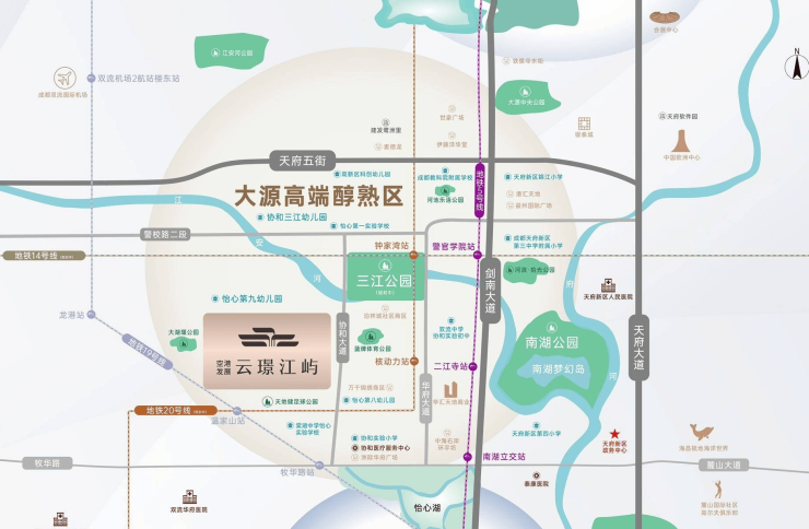 路网:剑南大道、天府五街双主干道环伺,3公里接驳大源商圈,8公里直达天府软件园。