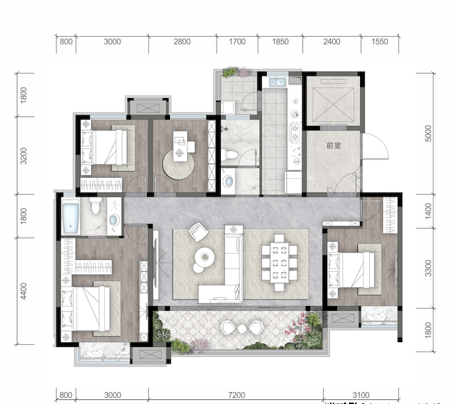 全系2T2纯板楼设计,127㎡起跳户型均做到四房两厅,152㎡主力户型享6.8米横厅+双套房。