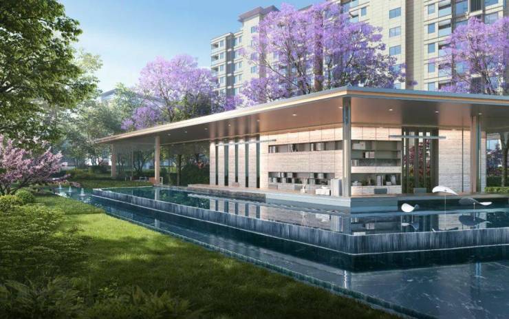 建筑外立面采用新亚洲风格,米黄色基调+铝板线条,质感高端。