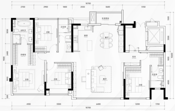 建面约174㎡(四房):双面观景,南向面宽约15.8m,LDKG一体化方厅,主卧套间约30㎡;