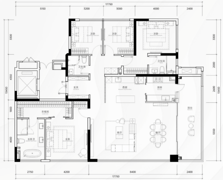 建面约174㎡(四房):双面观景,南向面宽约15.8m,LDKG一体化方厅,主卧套间约30㎡;