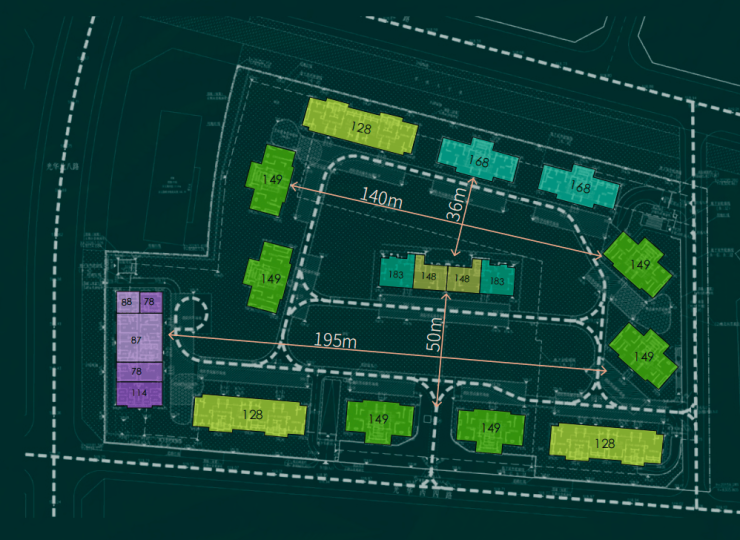 【户型图+实景小区+小区配套】东西楼间距在140-195米,南北是最短处是36米和58米,这样的空间布局,这样的大中庭和楼间距,是外光华其他新盘所不具备的。