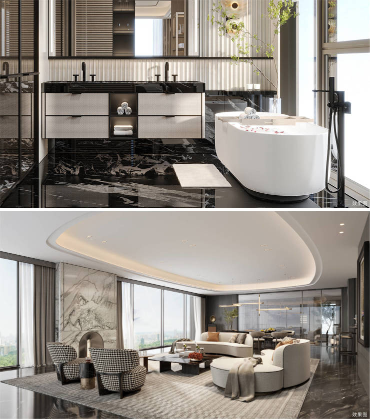 高端配置:私汤入户、超90%玻璃幕墙,嘉格纳/劳芬等奢装,3600㎡会所含同步院线影院。