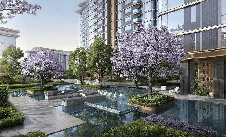 ▌【景观篇】 14%软景中水景占比约14%,媲美百亩级大盘水景规划引水入园,打造三大中庭水景,总计约1400㎡水系面积。甄选紫薇、泰山油松、蓝花楹等全球名木,匠造九章景观节点。