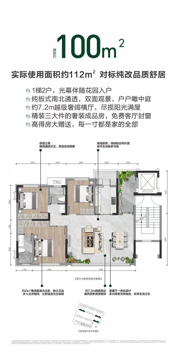 【项目基本信息】项目开发商:成都佳禾润悦房地产开发有限公司,项目占地:53亩,物业类别:纯板式社区,容积率:约2.0,得房率:113% ,绿化率:约35%,总户数:586户,交付标准:精装(三大件),装修标准:2828元/m²,物业:龙湖物业,物业费:2.6元,车位数量:727个,楼栋层高:8-16F,层高:3.1米,梯户比:1T2/2T2,面积段:100-117-130㎡ ,单价:预计1.45万左右