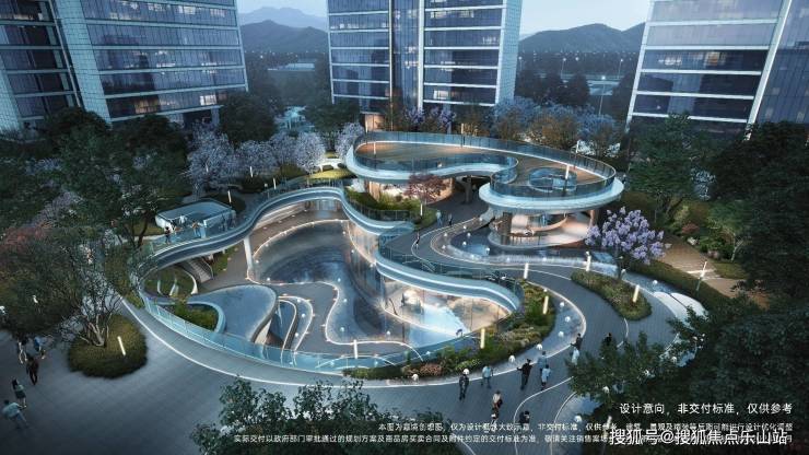 ·水翼流芯:景观设计整体形态,取境东安湖城市向往,以微流体象征水系流动韵律