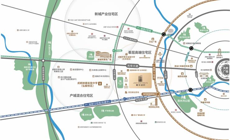 自驾:三横(日月大道/光华大道/光华八线)+三纵(三环路/武青路/绕城高速),至天府广场约10公里,金融城约14公里。