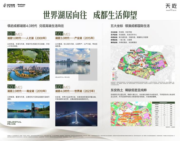 【实力品质,低密纯居】2.0低密纯居,新希望地产实力品质保障天屹2.0低容积率,居住舒适度更高,全T2板楼设计,更低公摊,更高性价比,围合式布局,更阔楼间距,更大户型面宽,洋房/小高产品后期流通性更巧;新希望地产精耕成都26载,在城东打造D10天府、锦粼府等高端代表作,引领城东生活迭新;龙泉驿区的锦粼府和皇冠湖1号小区二手房价格更是领衔区域。