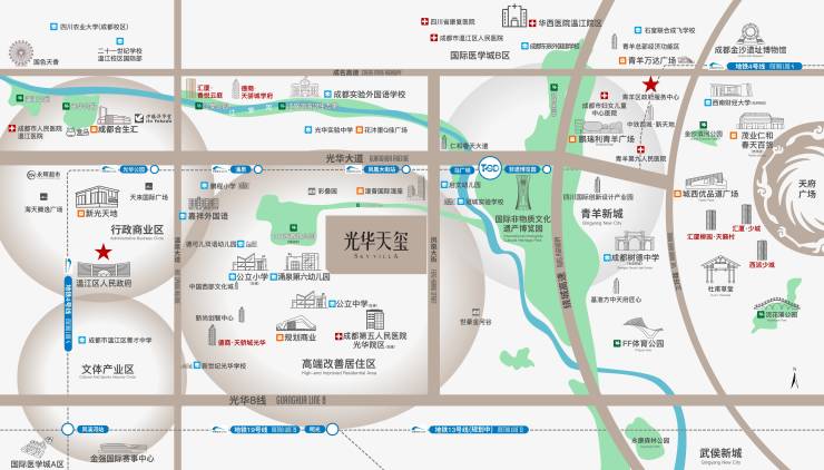 光华天玺位于光华新城南,土地价值第一梯队。温江向东,青羊向西,双区门户配套资源共享。项目3KM、5KM生活圈拥有城市顶级配套资源,周边马厂坝TOD、合生汇、新光天地、成都市实验外国语学校等醇熟配套,满足高品质生活所需。