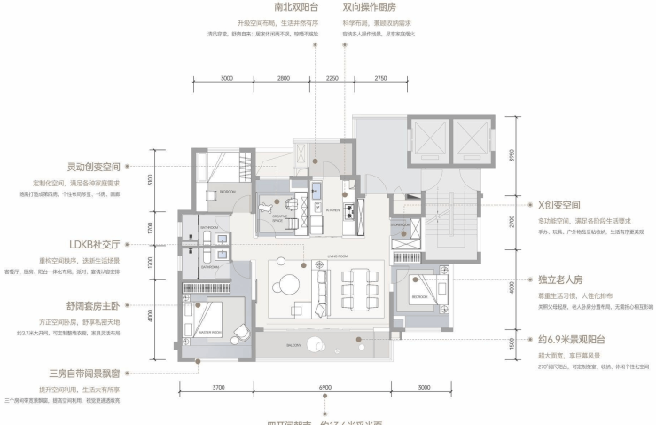 【LDKB社交厅】约6.9米大面宽客餐厅与厨房、阳台无界连通