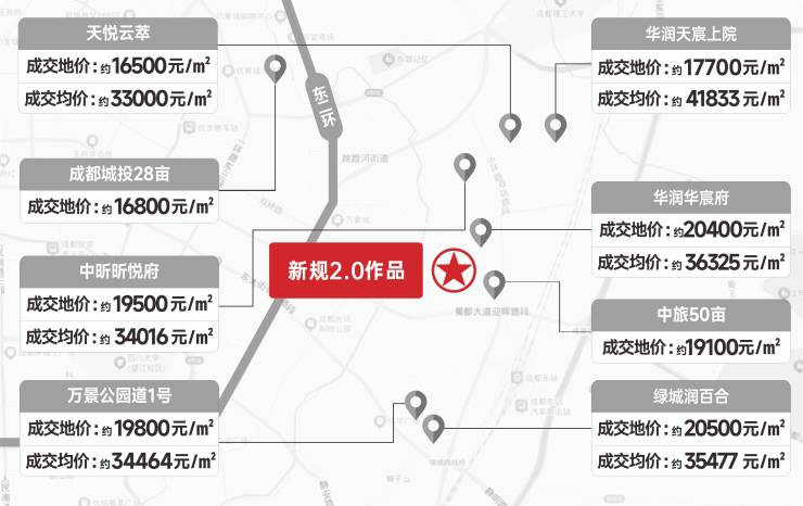 万象城东,位于沙河豪宅带与东大街豪宅带交汇之处,继承两大豪宅带的土地禀赋,顶配资源环伺,一线品牌房竞相争藏,2025年成华区成交地块 13宗,2万左右单价地块成交7块,均在区域周边,其中最高溢价51%,为全城最高。目前华润,绿城入市项目均价3.5 万+, 华宸府开盘价达 3.6-4.1 万,持续热销,高端属性大势已成
