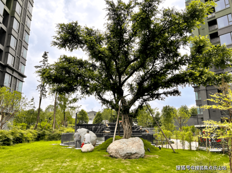 约600㎡的下沉式广场设有喷泉,广场四周种植有榕树、流苏、国槐等乔木,目测这些乔木年头都挺长。