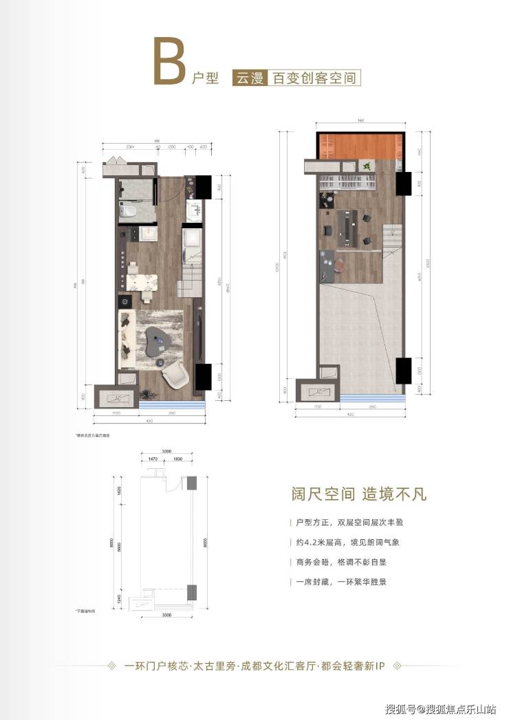 【著作城芯臻品】项目预计首开推售B座办公类产品,层高4.2米,预计建面约38㎡左右,梯户比6T29,创客空间、商业办公,功能灵活多变。