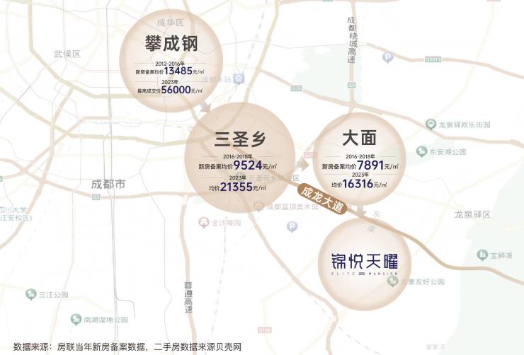 从攀成钢到三圣乡再到大面,成龙大道宛如一条璀璨的金色丝带,巧妙地将这些重要节点串联起来,形成了一条独特的城市发展轴线,串联着过去、现在与未来,见证着城市的崛起与变迁。成龙大道的发家史,有迹可循,有据可依,不同区域的日益见涨的房价,无疑是最好的佐证。
