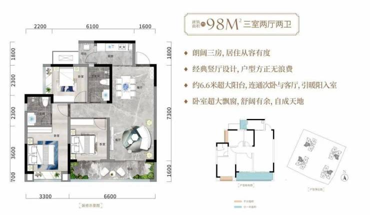 户型亮点:以门槛户型为例,不到100㎡的建面,得房率高达约94%,不仅有套三双卫双阳台的稀缺指标,观景阳台更有约6.6m的阔尺视野面。约21㎡的主卧、套房设计,次卧面积均超过10㎡,尺度感直逼市面上120㎡的改善户型,完全可满足青年置业的购房需求!