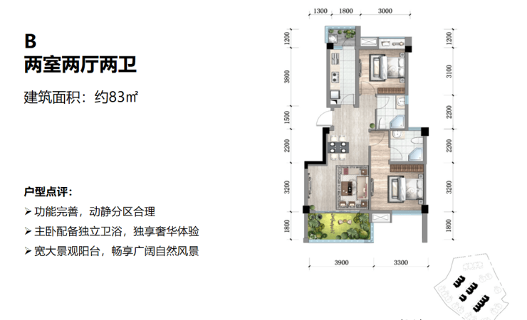 B户型面积81㎡套二双卫设计,前后通透,小区中庭楼王位置享受中庭园林景观同时关山视野极佳。总价:62万