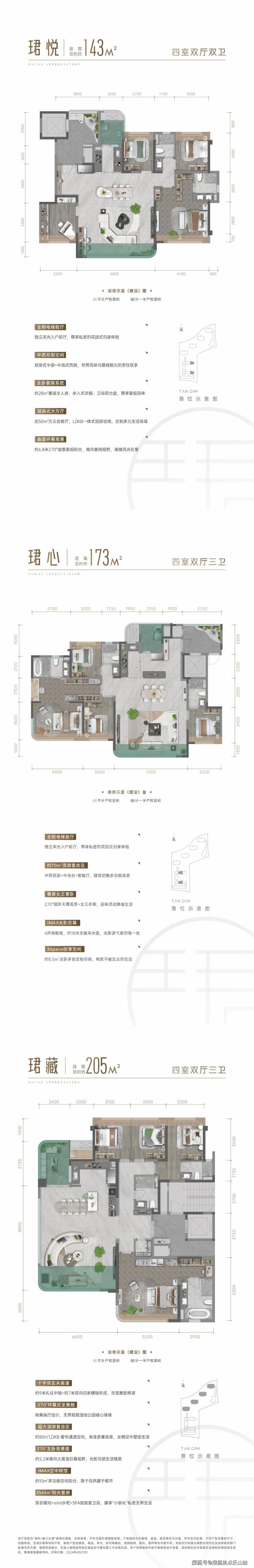 建面约173-205㎡:奢阔横厅,双套房配置,创新“全景舱”阳台,兼顾家庭社交与私密性。