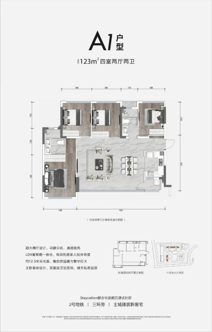 梯户比:2T3户、2T4户,面积:100㎡套三-123㎡套四