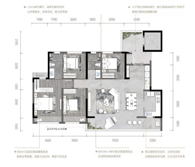 约9.3米南向阳台+横厅:五面朝南,270°采光,层高3.1米。