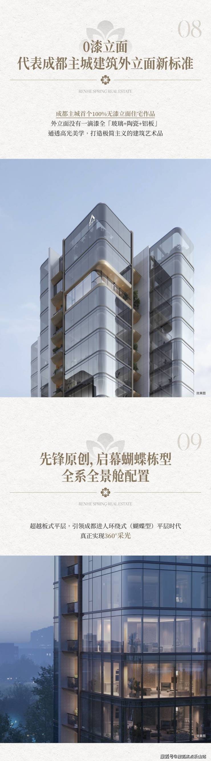 成都首个 100%无漆立面 住宅,采用“玻璃+陶瓷+铝板”材质,创新“蝴蝶栋型”布局,实现360°环绕采光。