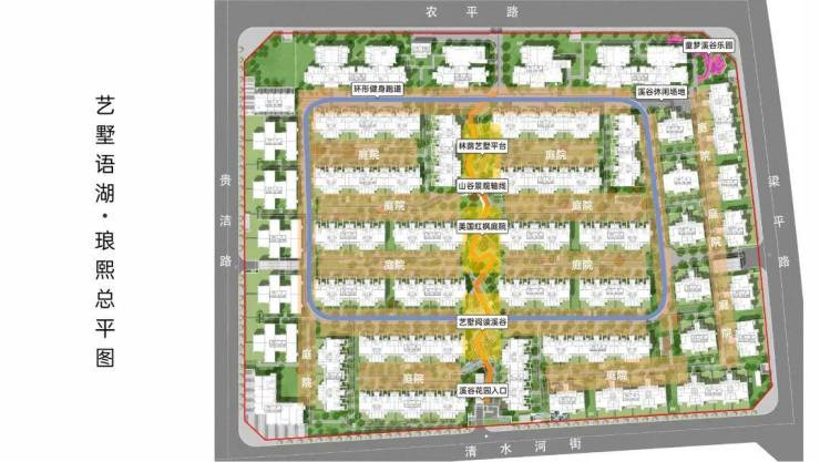 三重景:约240㎡景观艺墅水景、约100㎡艺墅阅读溪谷、约150㎡美国红枫庭落